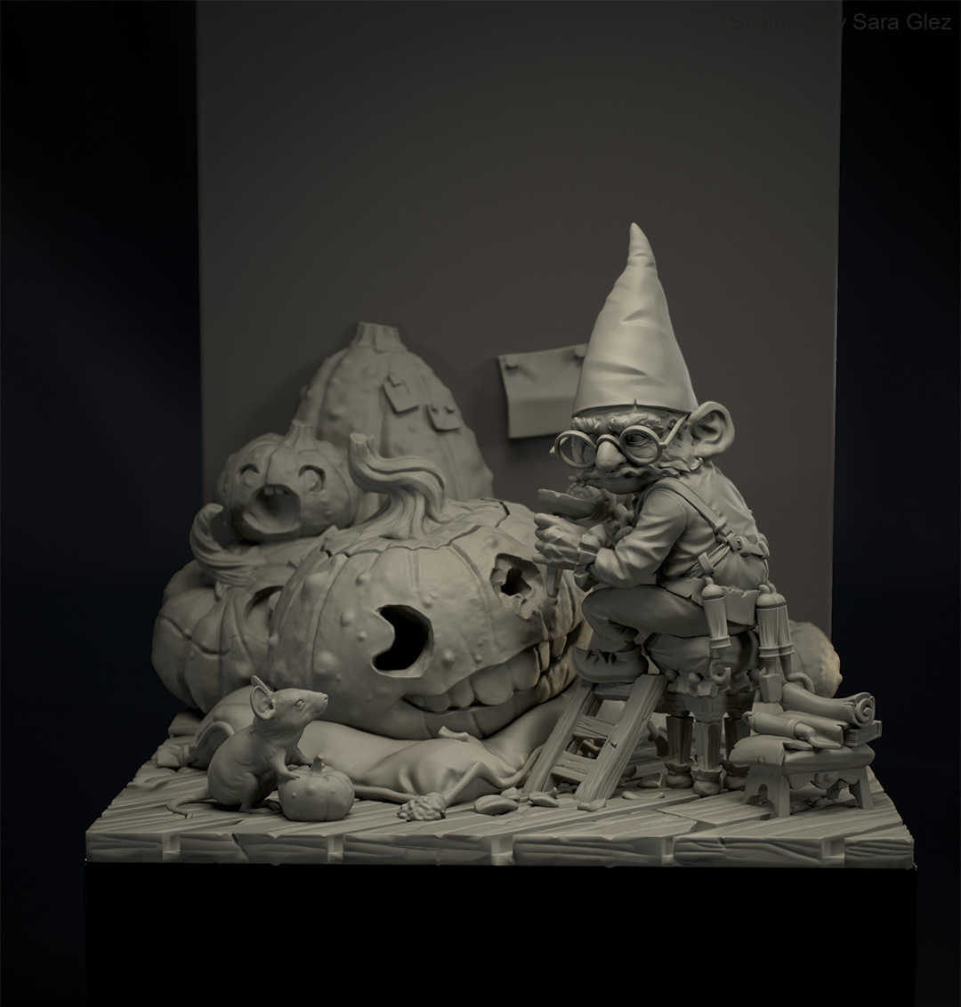 Escultura en miniatura de un gnomo tallando una calabaza gigante en escena detallada