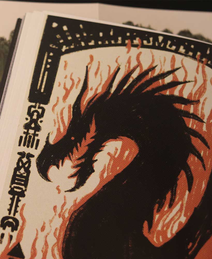 La coherencia gráfica no se limita a momentos puntuales; atraviesa todo el libro. La tipografía elegida, la colocación del texto en relación con las ilustraciones, la cadencia visual de las dobles páginas… todo contribuye a sostener una atmósfera de cuento oscuro, de leyenda susurrada al calor de un fuego que no termina de iluminar del todo. Es un libro que se siente pensado como objeto, no solo como contenedor de reglas.